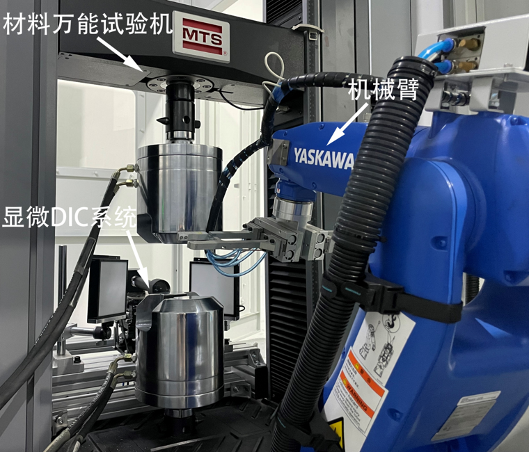 高通量力学性能测试平台由“数字图像相关系统”、“自动化流程系统”和“材料万能试验机装置”三个子系统组成,可以在宏观尺度和显微尺度下开展材料或结构的高通量全自动拉伸、压缩和循环加载等试验研究(最高1100°C),实现原位的非接触式全场变形测量与表征。该测试平台不仅适合金属材料,同时适用于复合材料、橡胶、线材和柔性材料等。